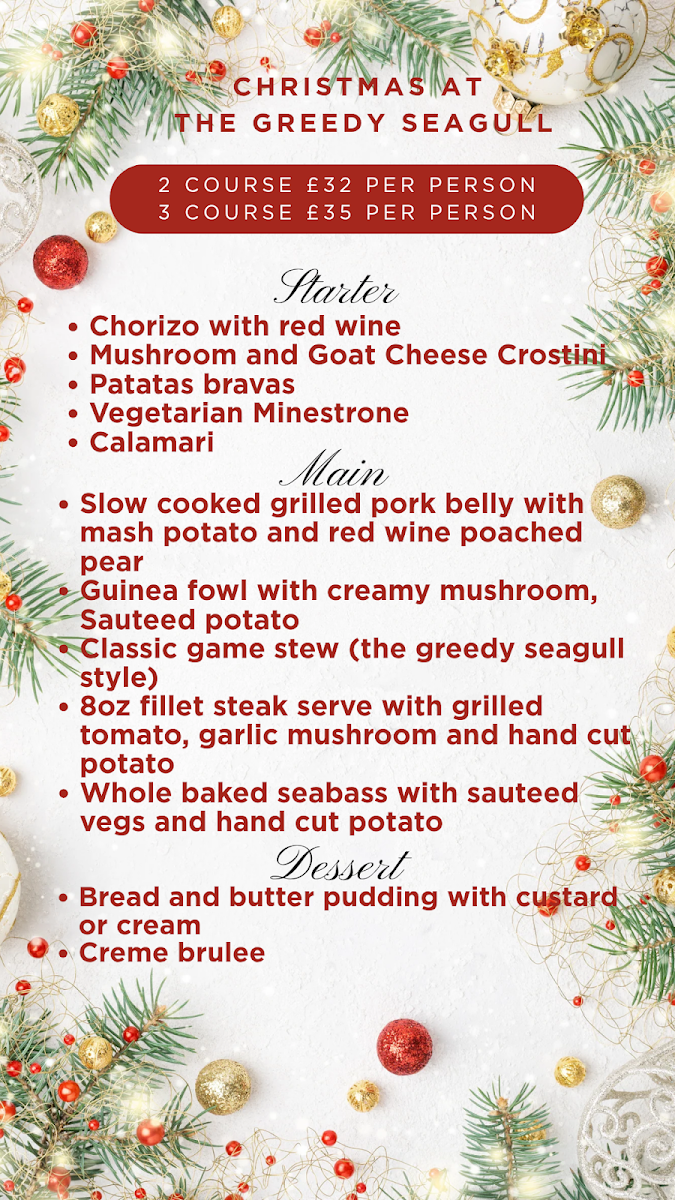 In conclusion, The Greedy Seagull's menu is diverse, offering a wide selection of flavorful starters, hearty mains, and an excellent range of wines and sparkling options to complement every meal. Whether you're in the mood for a steak, seafood, or something vegetarian, there's something here for every palate, ensuring a memorable dining experience.